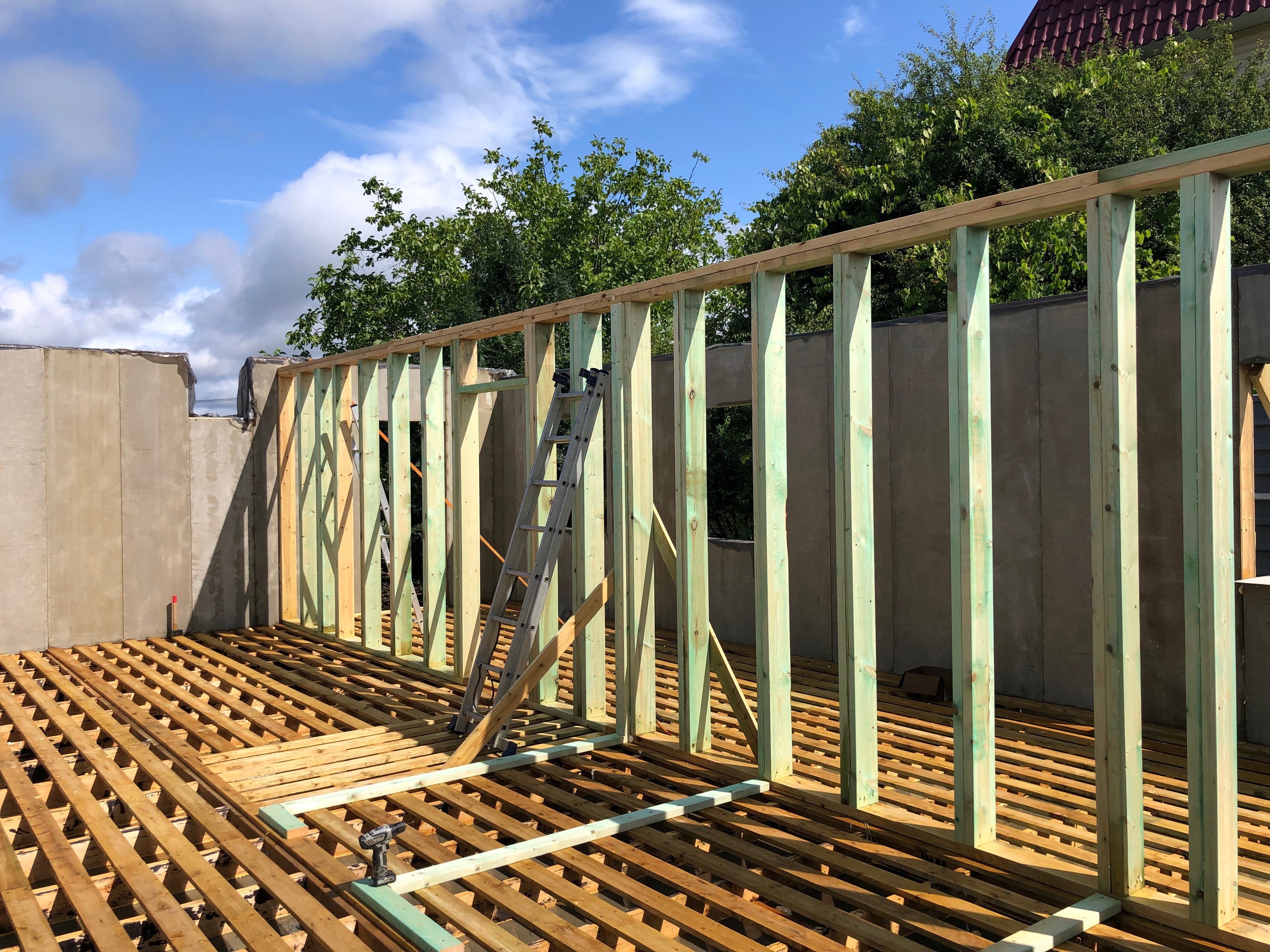 В межэтажных перекрытиях в качестве несущих лаг мы применяем двутавровые балки собственного производства с влагостойкой 24 мм. фанерой в сердечнике.