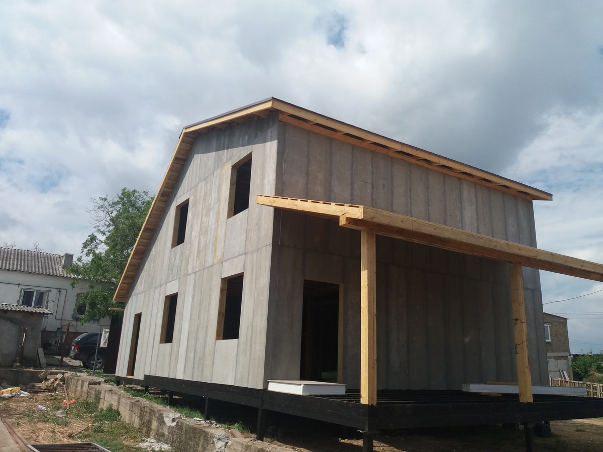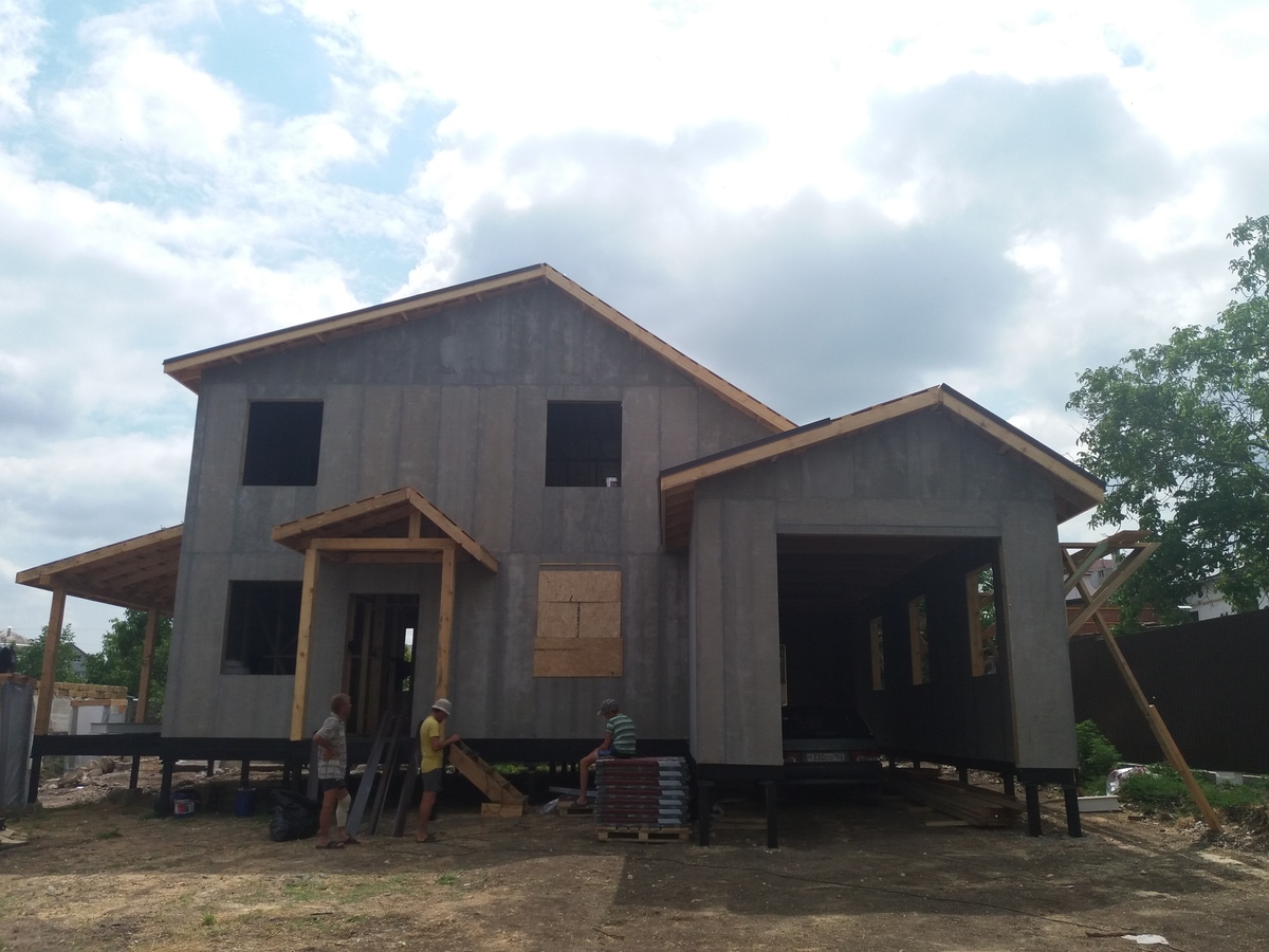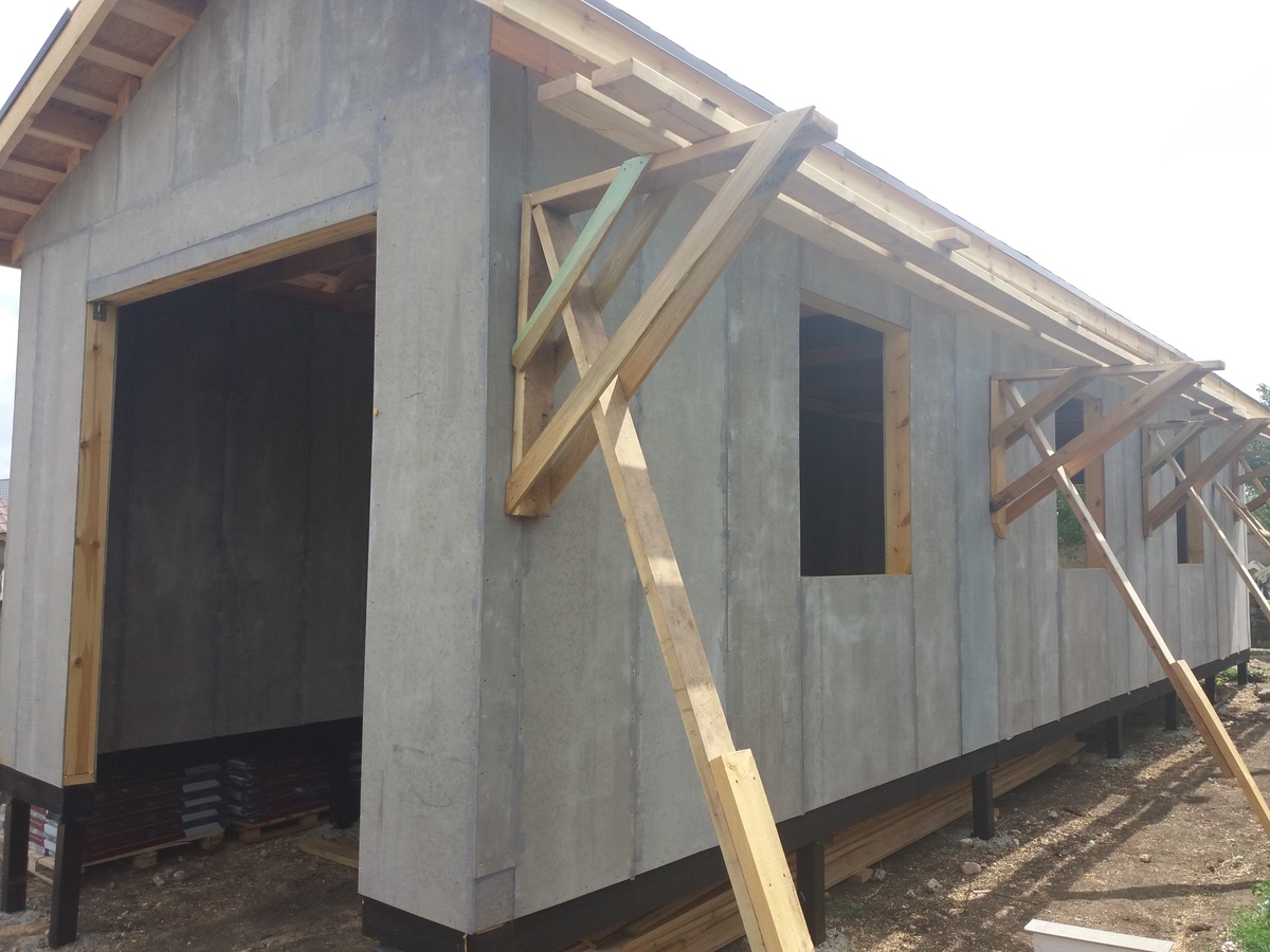 из СИП панелей из ЦСП размером 2700*1200*168 мм с антисептированным калиброванным пиломатериалом камерной сушки (46*140 мм). Монтаж каркасов несущих перегородок из пиломатериала 38*89 мм (76*89 мм).