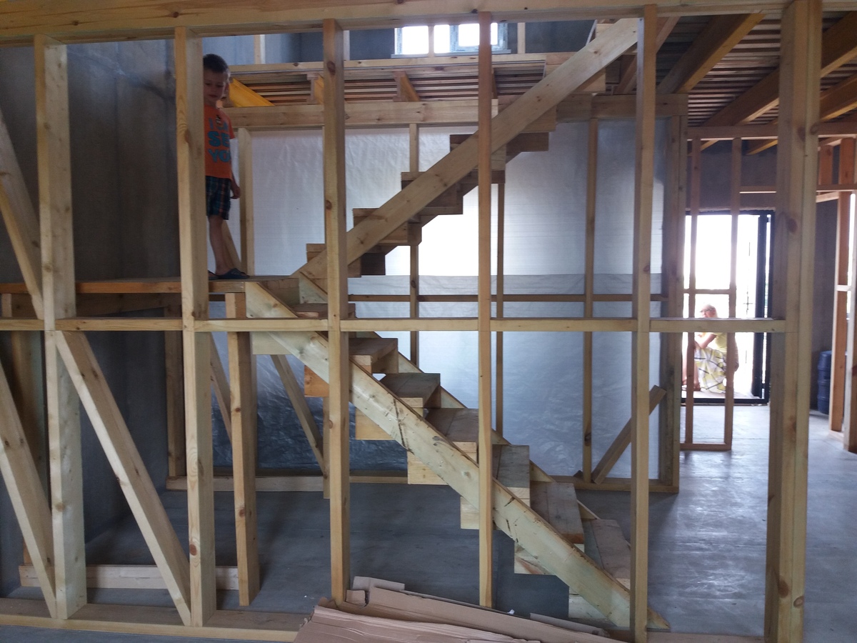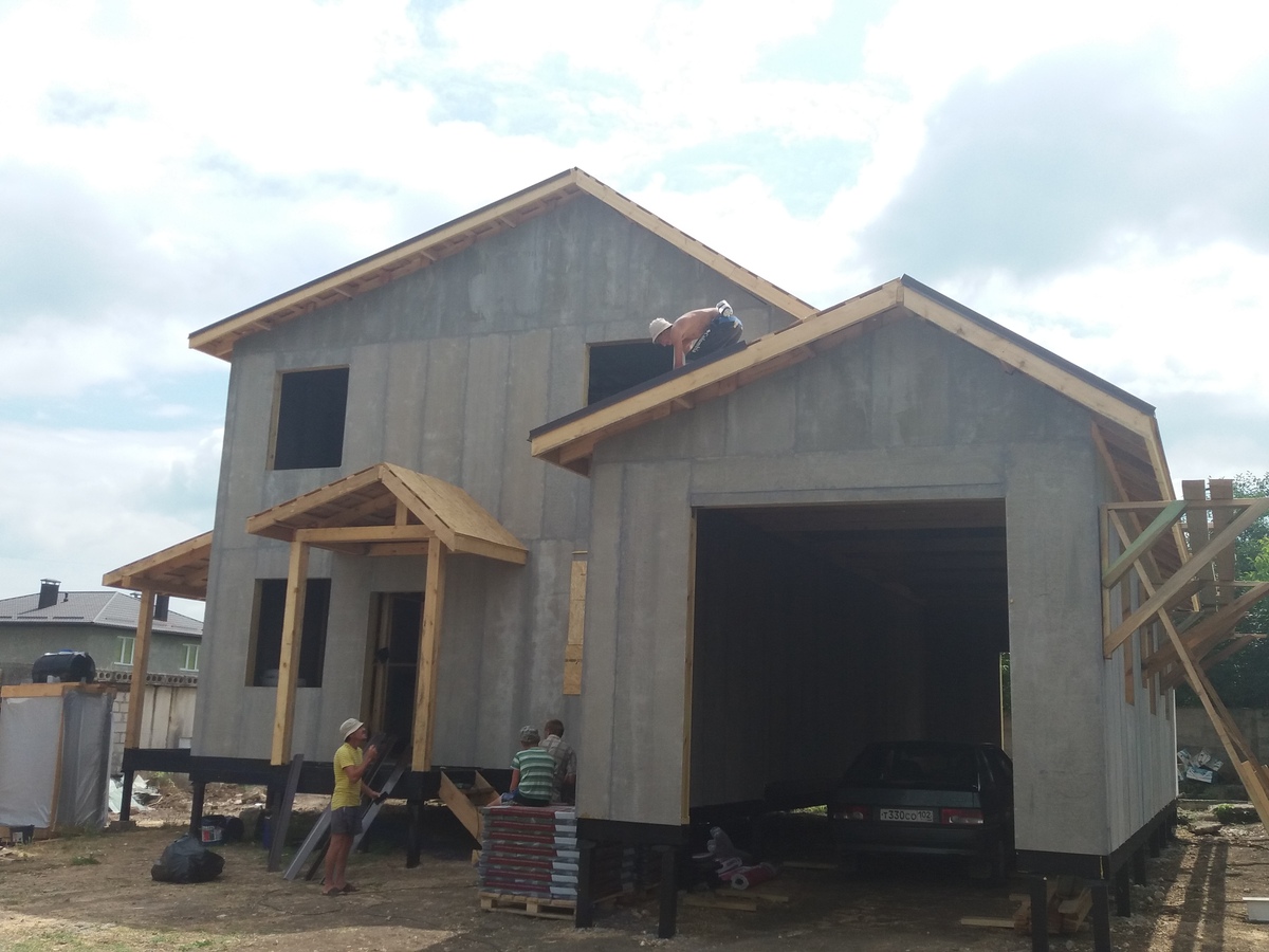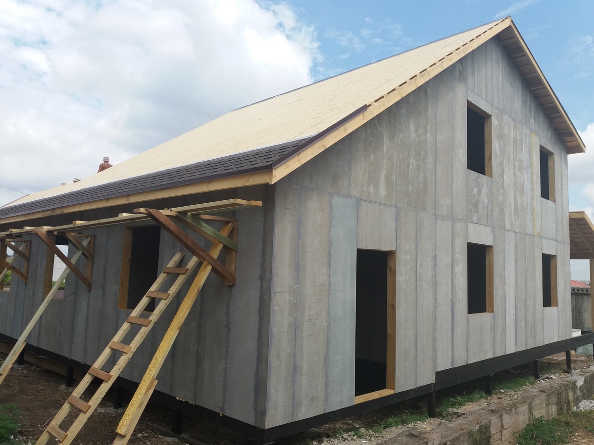 из СИП панелей из ЦСП размером 2700*1200*168 мм с антисептированным калиброванным пиломатериалом камерной сушки (46*140 мм). Монтаж каркасов несущих перегородок из пиломатериала 38*89 мм (76*89 мм).