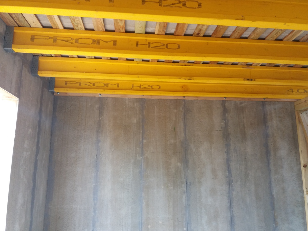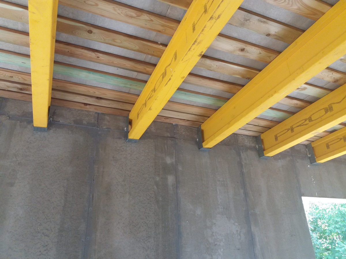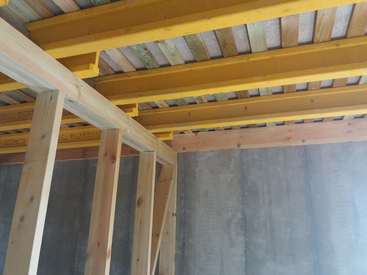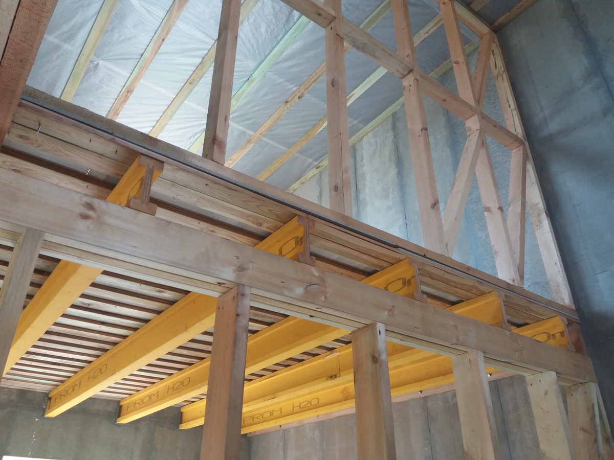 В межэтажных перекрытиях в качестве несущих лаг мы применяем двутавровые балки собственного производства с влагостойкой 24 мм. фанерой в сердечнике.