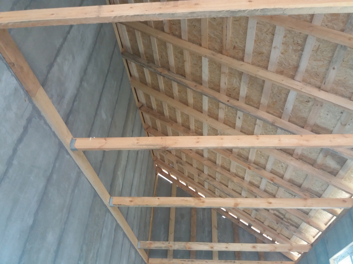 пиломатериал 1-го сорта естественной влажности, антисептированный (стропила 50*150 мм, обрешетка, поперечная обрешетка), пароизоляция А, D, утеплитель 150 мм, софиты (С-8 профиль), кровля - металлопрофиль (металлочерепица).