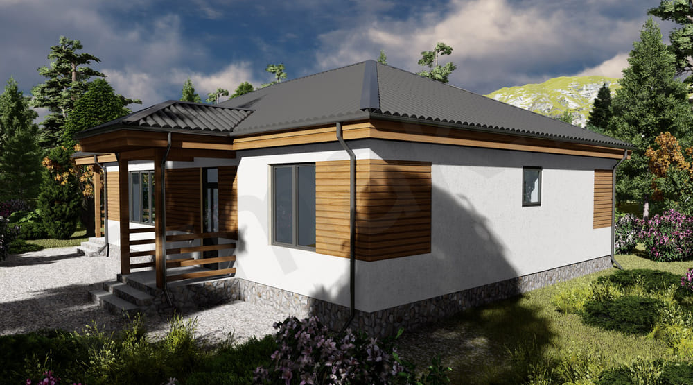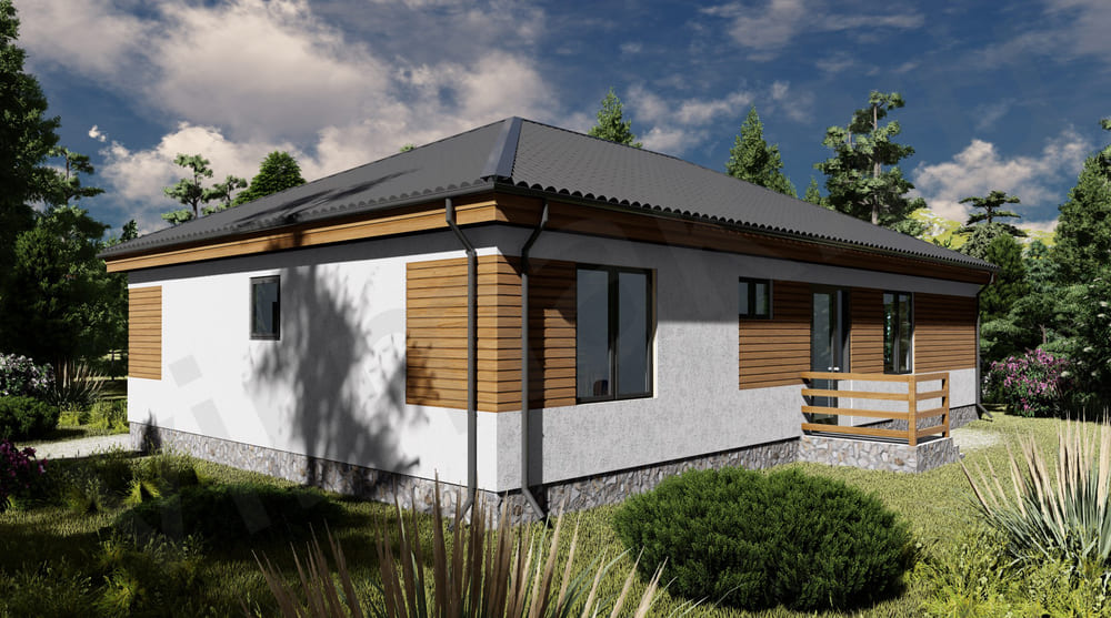 • Плоская или скатная утепленная кровля (пароизоляционная пленка, утеплитель вата на основе стекловолокна или базальта, гидро-ветрозащитная мембрана) с покрытием из металлочерепицы, полимерной мембраны или гибкой черепицы. (цена отличается от выбранного типа) (Ширина карнизного свеса от 30 см. Водосточная система в стоимость не входит