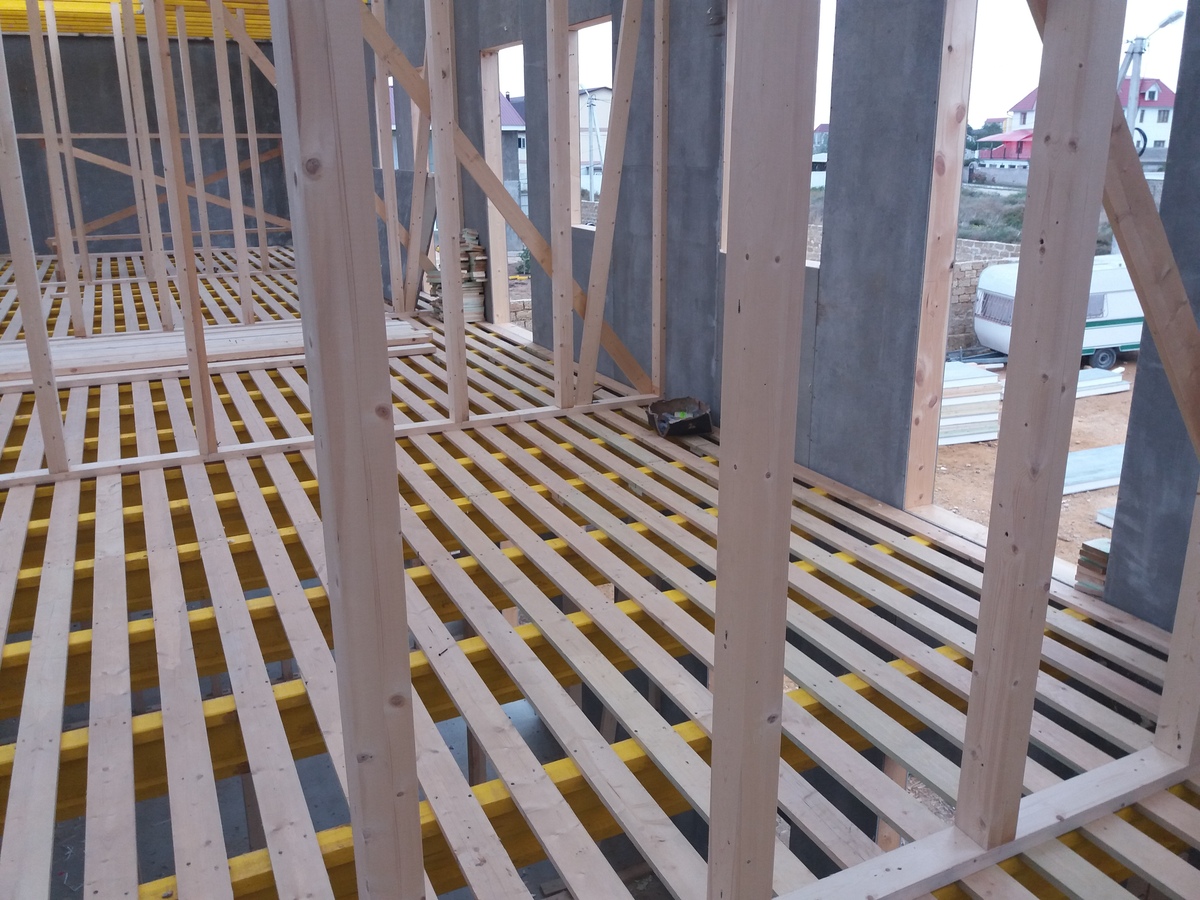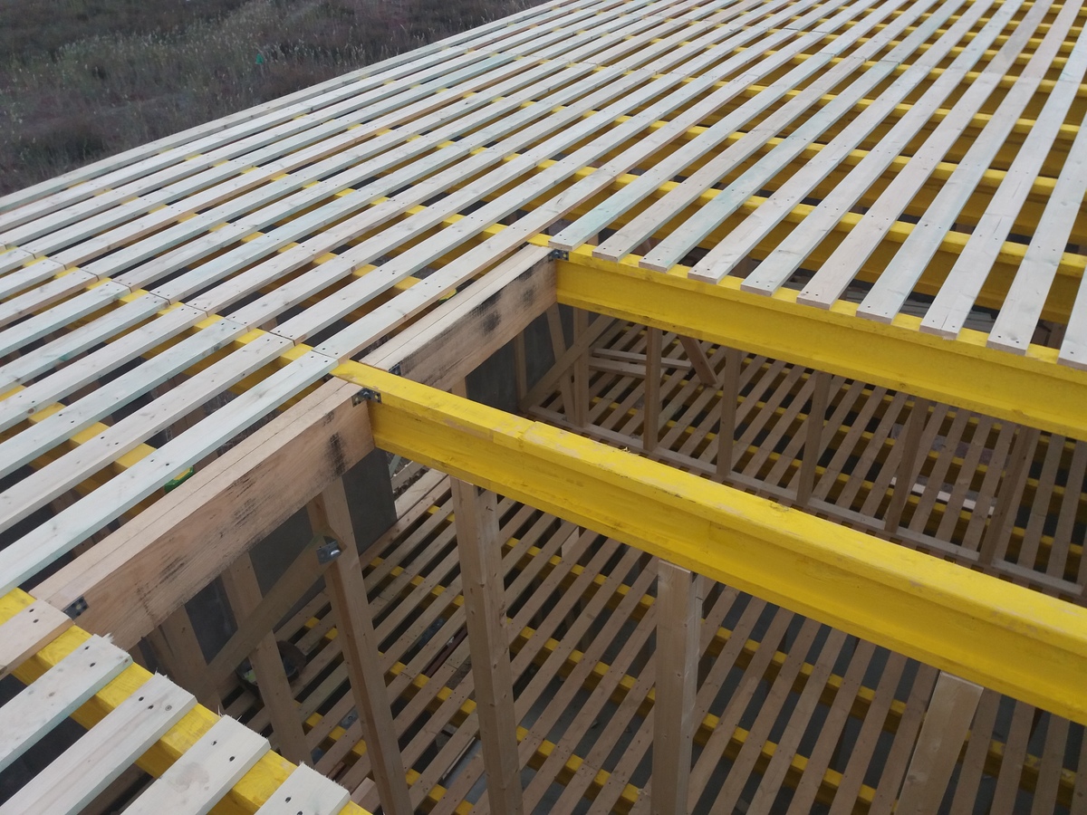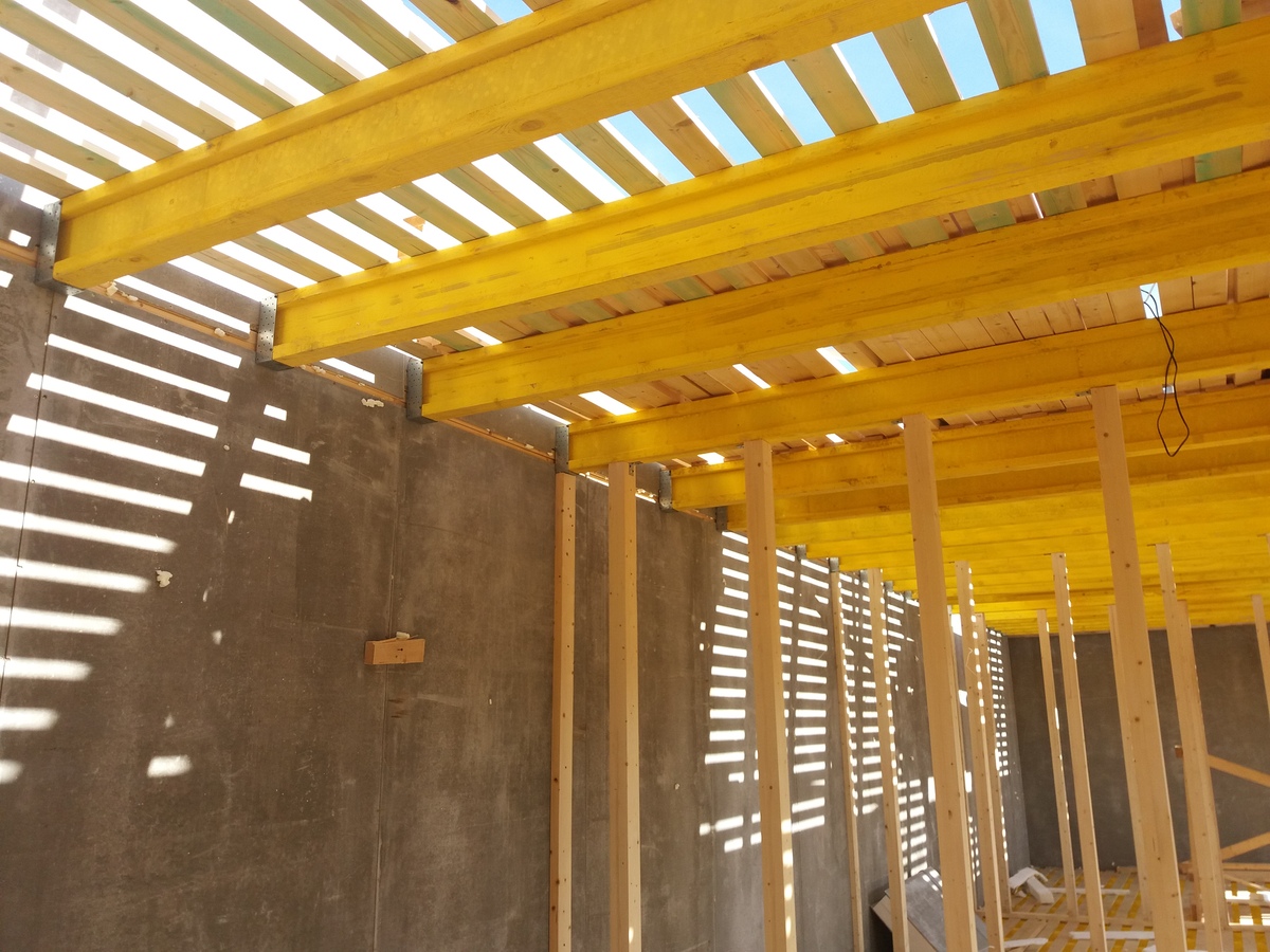 В межэтажных перекрытиях в качестве несущих лаг мы применяем двутавровые балки собственного производства с влагостойкой 24 мм. фанерой в сердечнике.