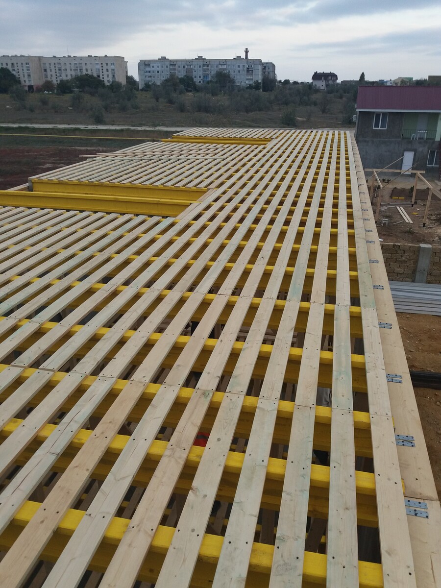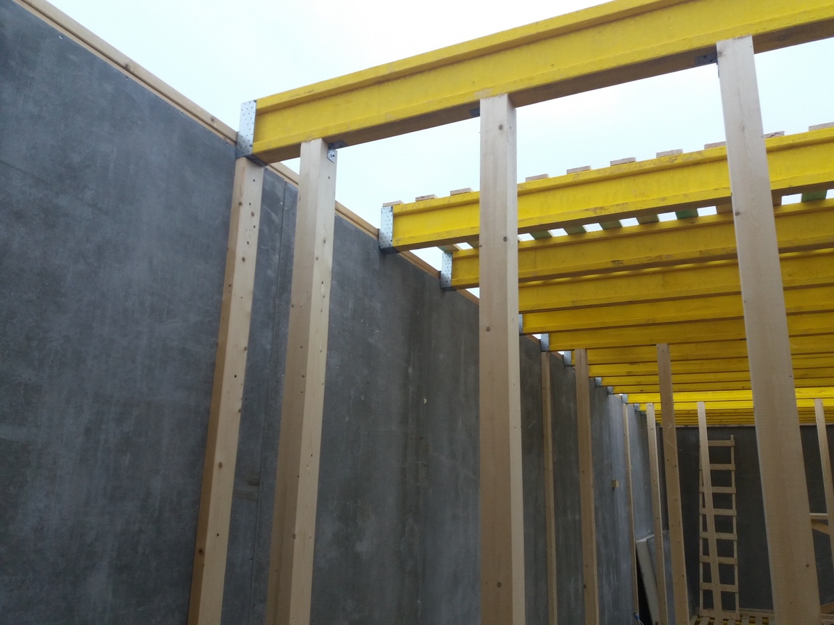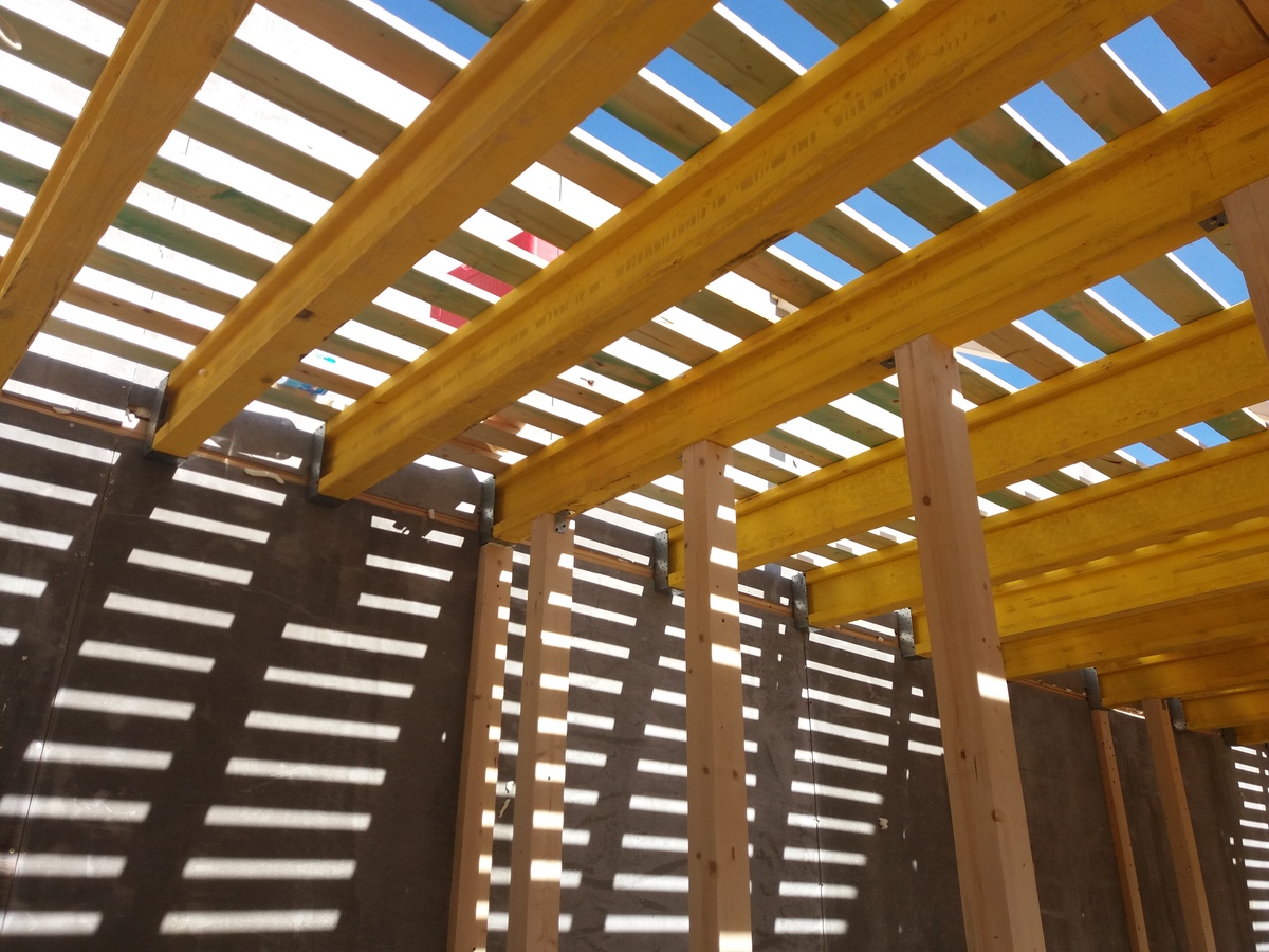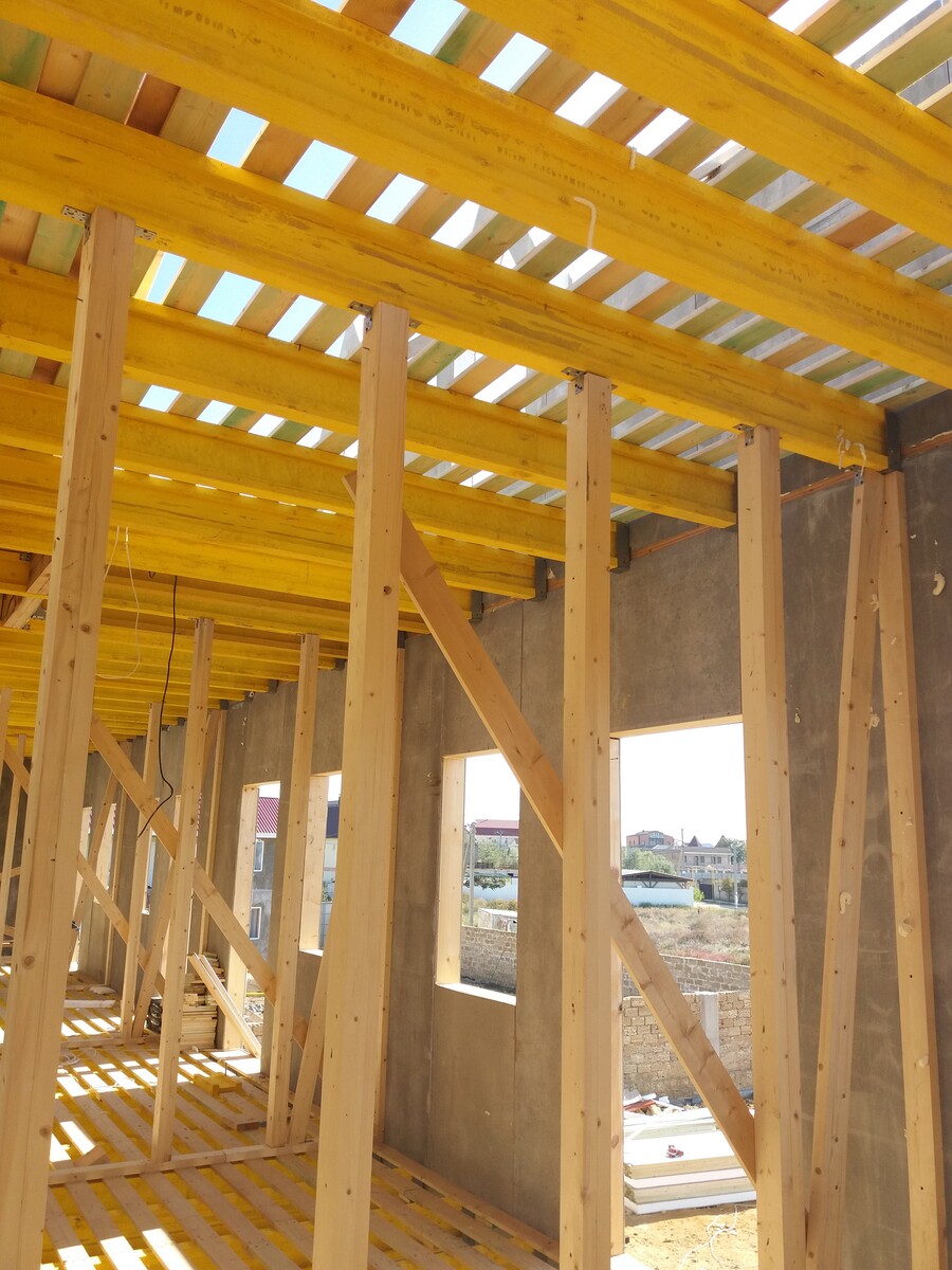 В межэтажных перекрытиях в качестве несущих лаг мы применяем двутавровые балки собственного производства с влагостойкой 24 мм. фанерой в сердечнике.