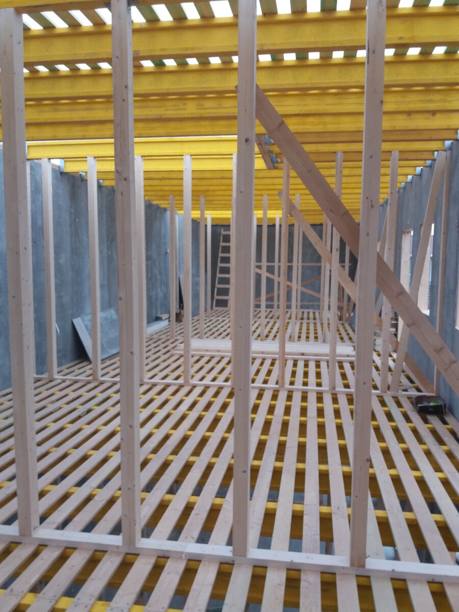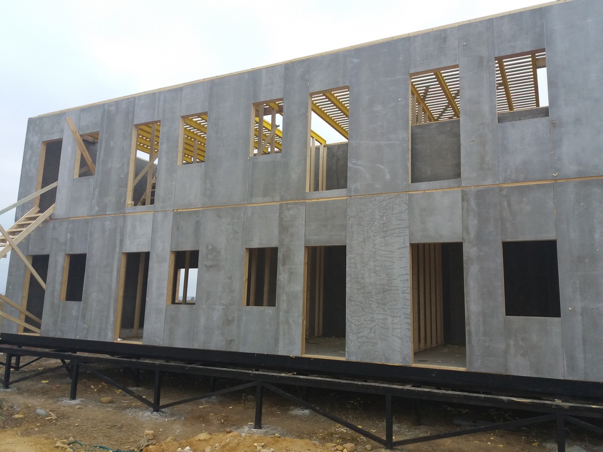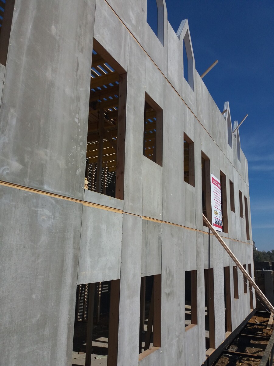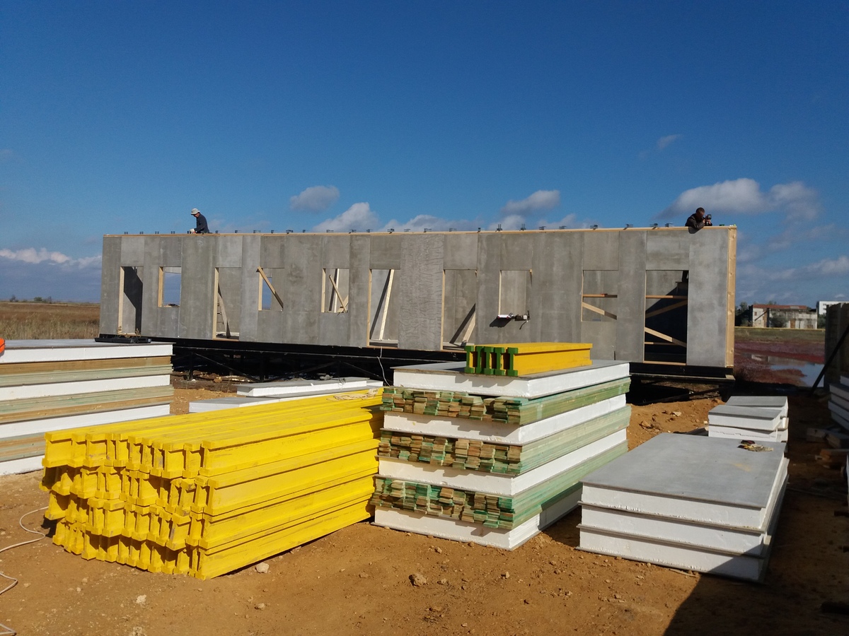 из СИП панелей из ЦСП размером 2700*1200*168 мм с антисептированным калиброванным пиломатериалом камерной сушки (46*140 мм). Монтаж каркасов несущих перегородок из пиломатериала 38*89 мм (76*89 мм).