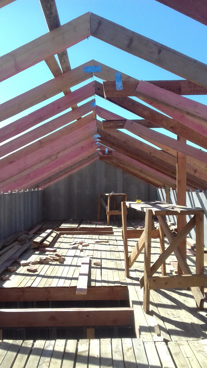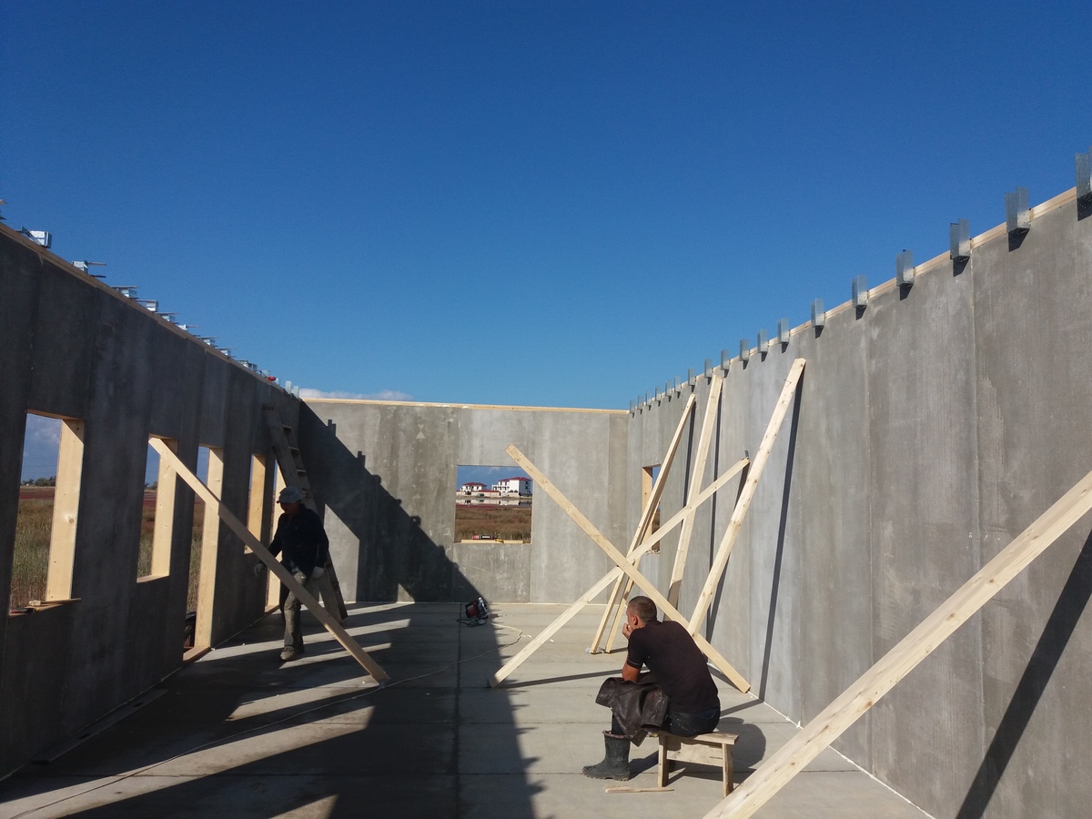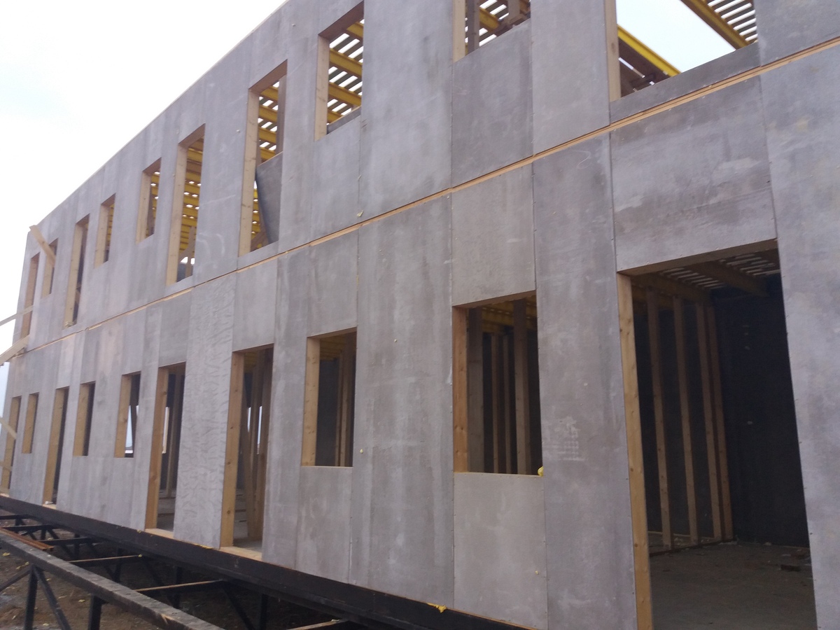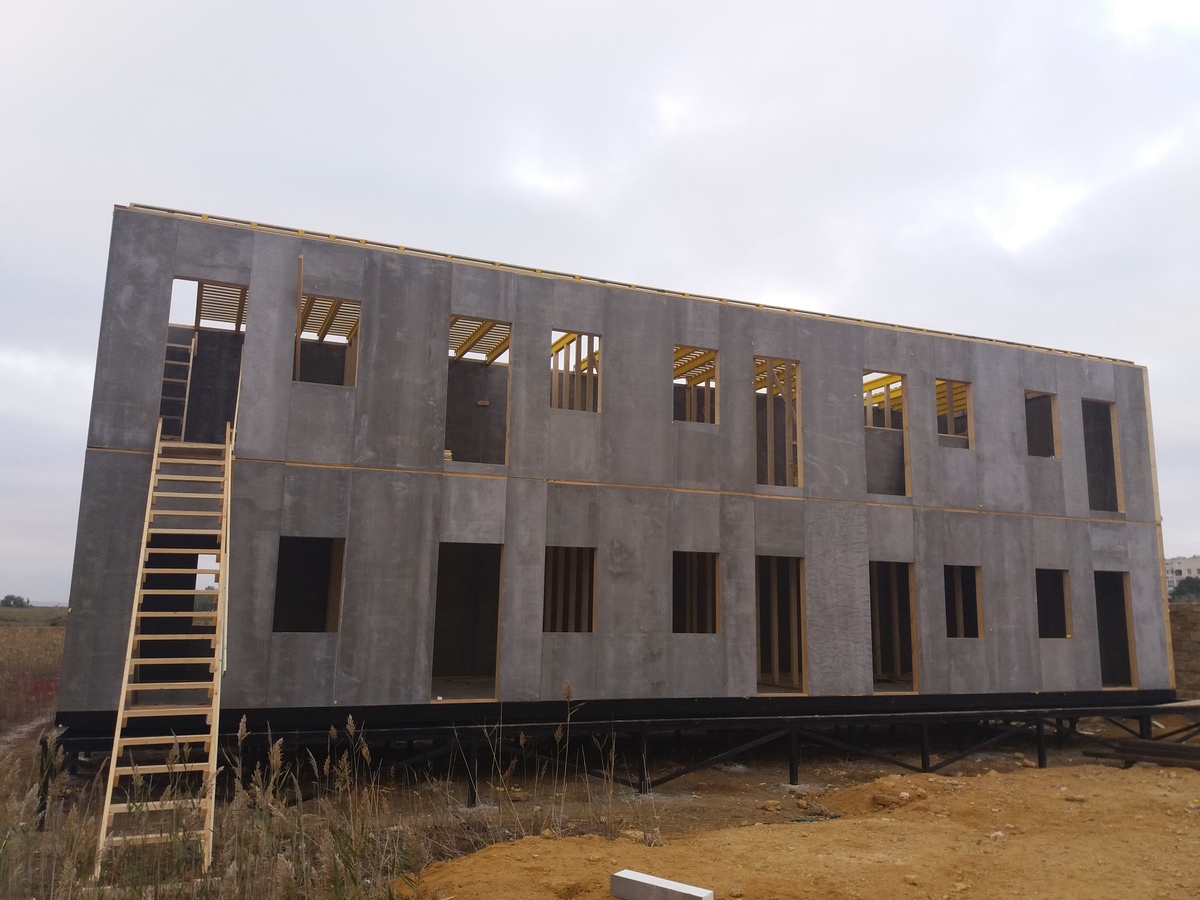 из СИП панелей из ЦСП размером 2700*1200*168 мм с антисептированным калиброванным пиломатериалом камерной сушки (46*140 мм). Монтаж каркасов несущих перегородок из пиломатериала 38*89 мм (76*89 мм).