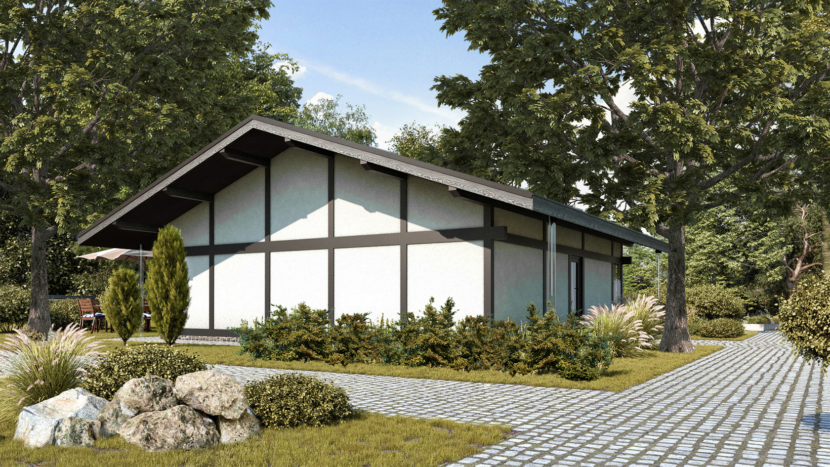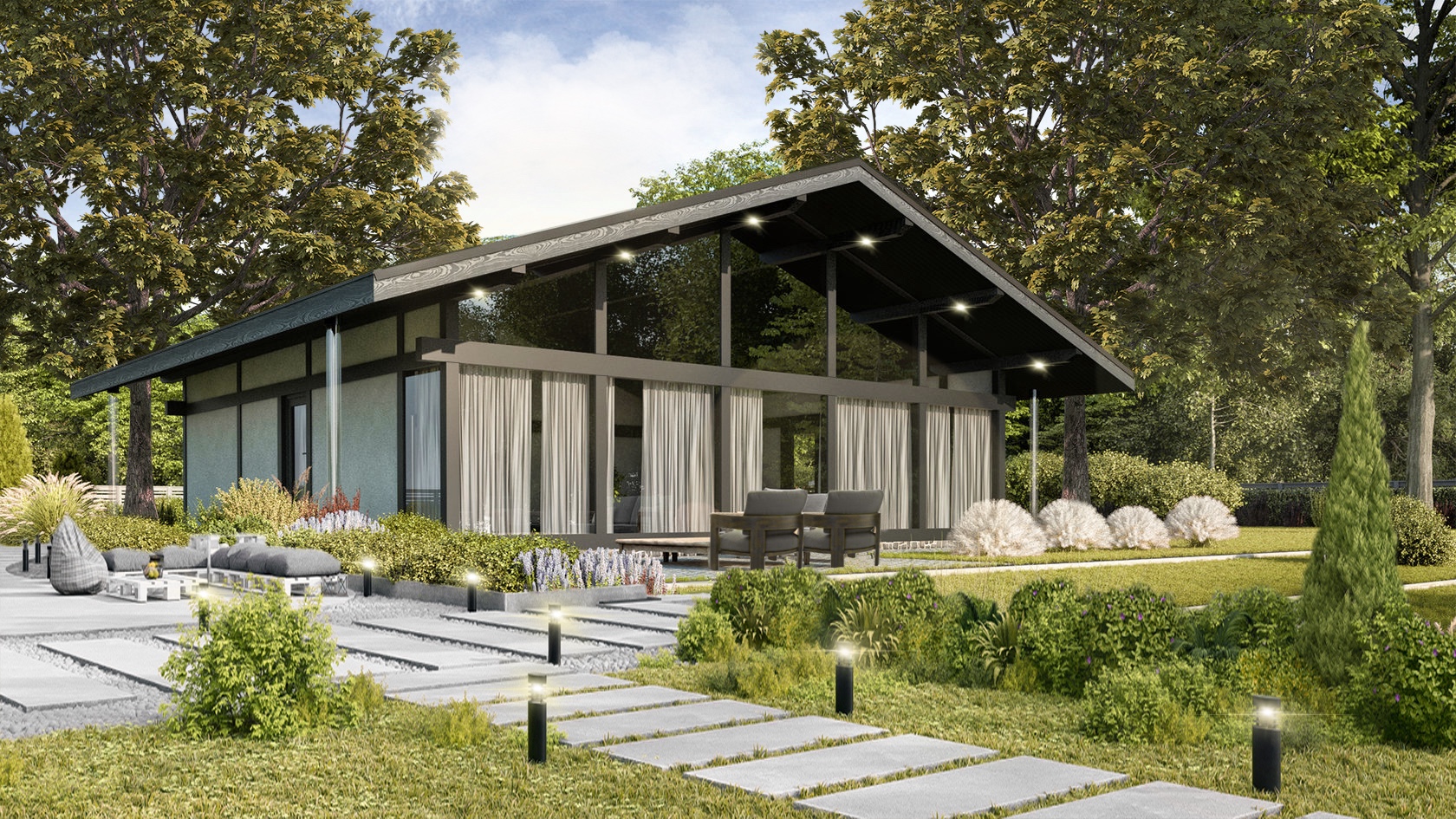 • Плоская или скатная утепленная кровля (пароизоляционная пленка, утеплитель вата на основе стекловолокна или базальта, гидро-ветрозащитная мембрана) с покрытием из металлочерепицы, полимерной мембраны или гибкой черепицы. (цена отличается от выбранного типа) (Ширина карнизного свеса от 30 см. Водосточная система в стоимость не входит