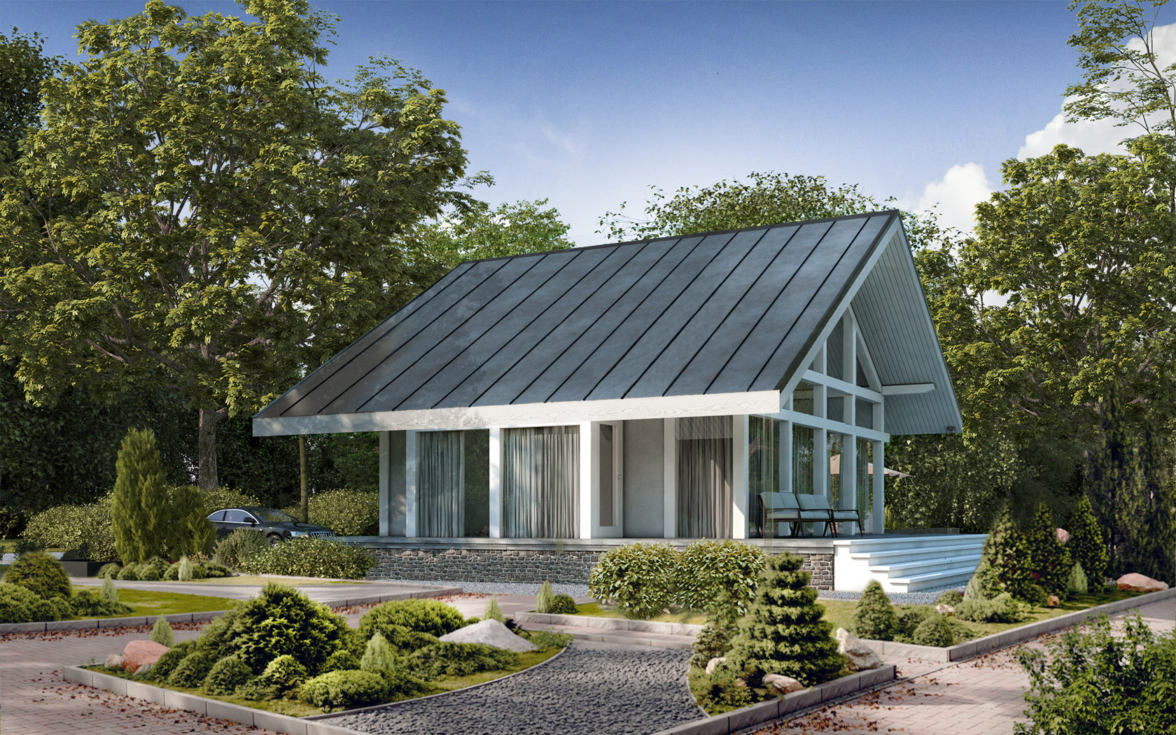 • Плоская или скатная утепленная кровля (пароизоляционная пленка, утеплитель вата на основе стекловолокна или базальта, гидро-ветрозащитная мембрана) с покрытием из металлочерепицы, полимерной мембраны или гибкой черепицы. (цена отличается от выбранного типа) (Ширина карнизного свеса от 30 см. Водосточная система в стоимость не входит