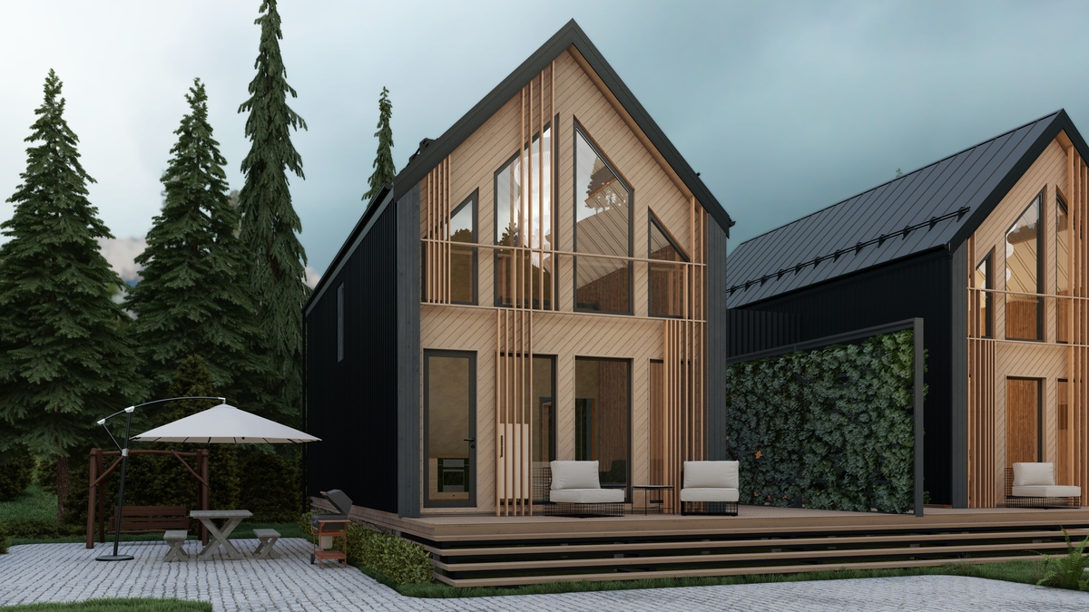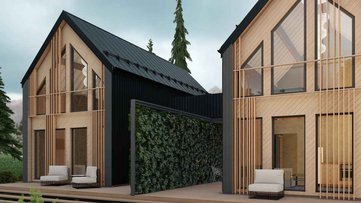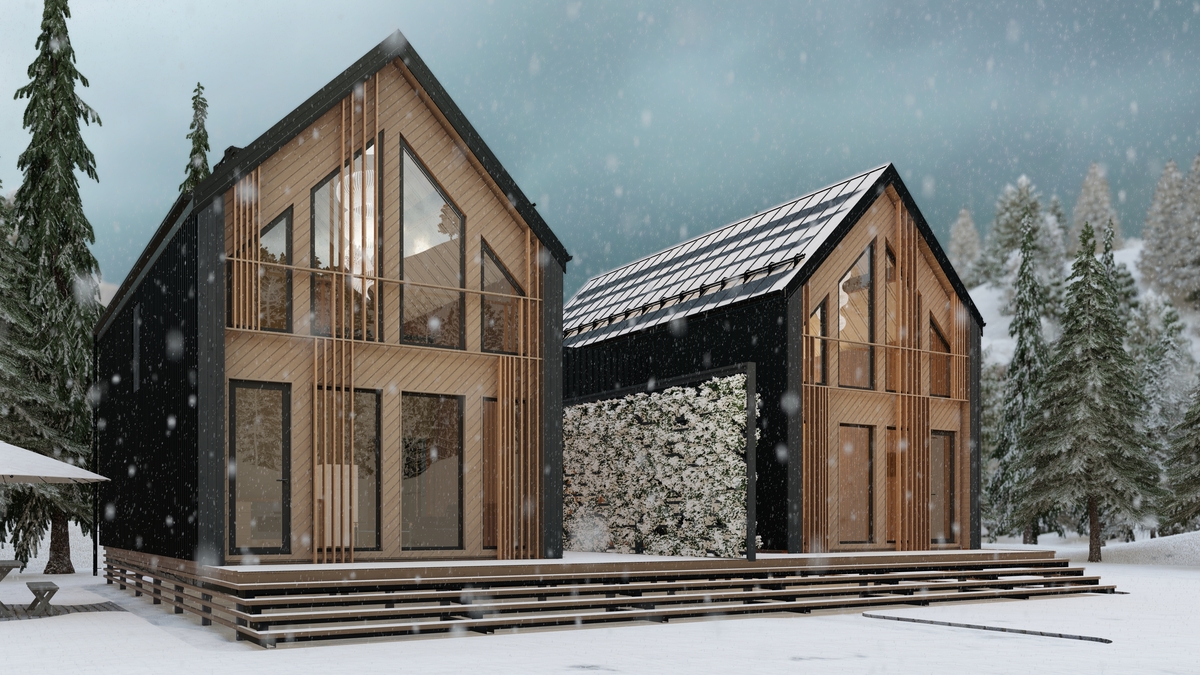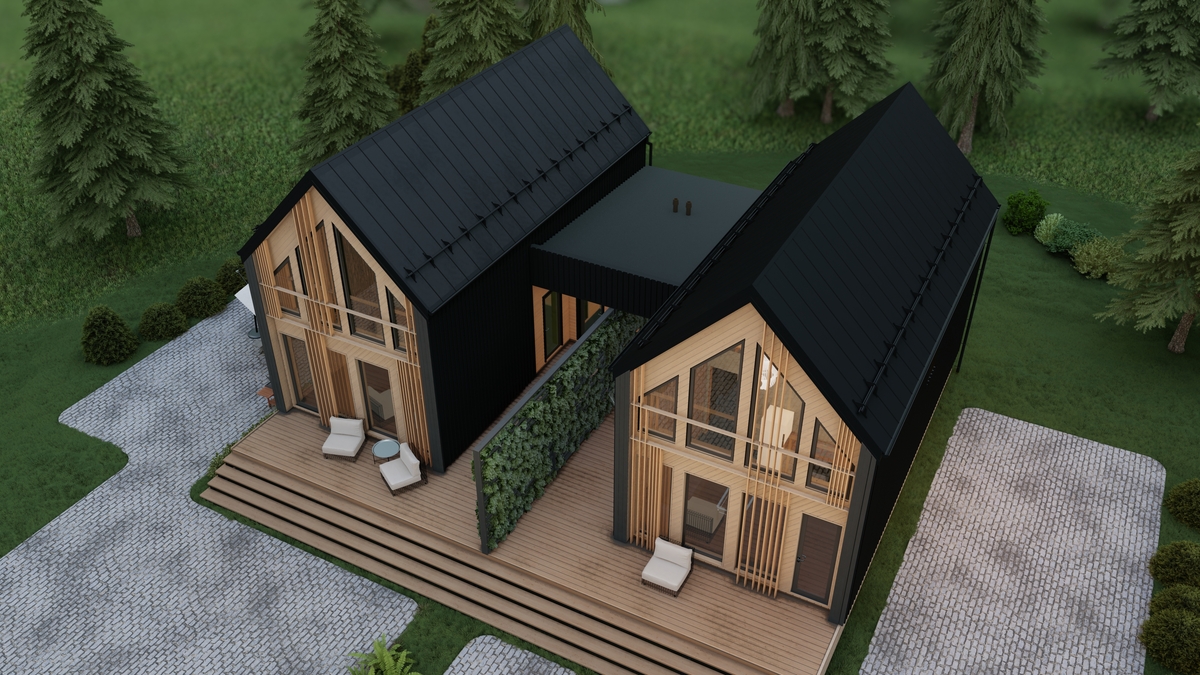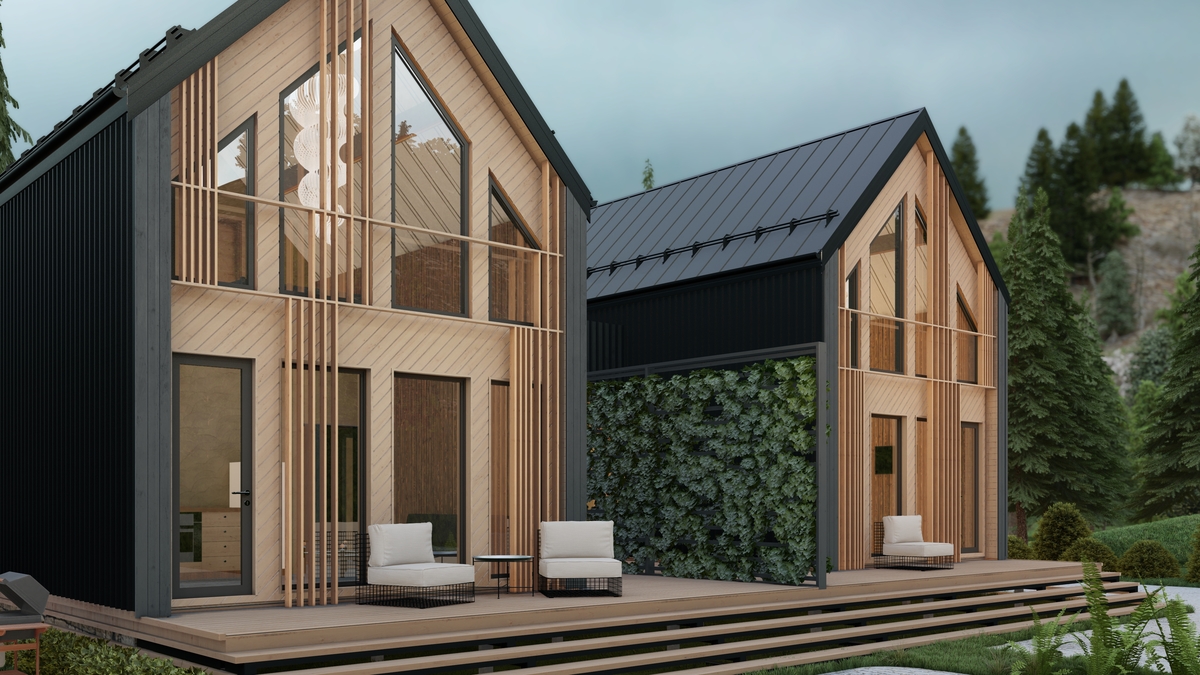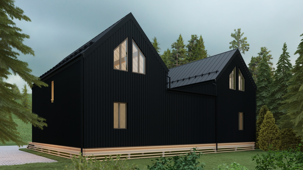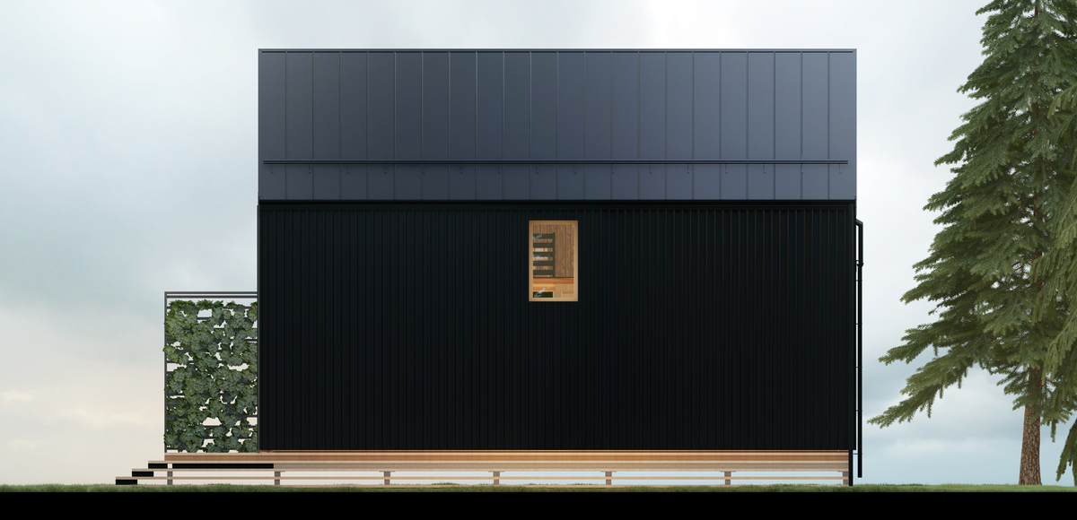 • Мансардная крыша — Сэндвич панель 150 мм с покрытием Кликфальц матовый Графит снаружи, белый глянцевый лист изнутри. Несущие прогоны из клееного бруса. (Готовность кровли под ключ)
