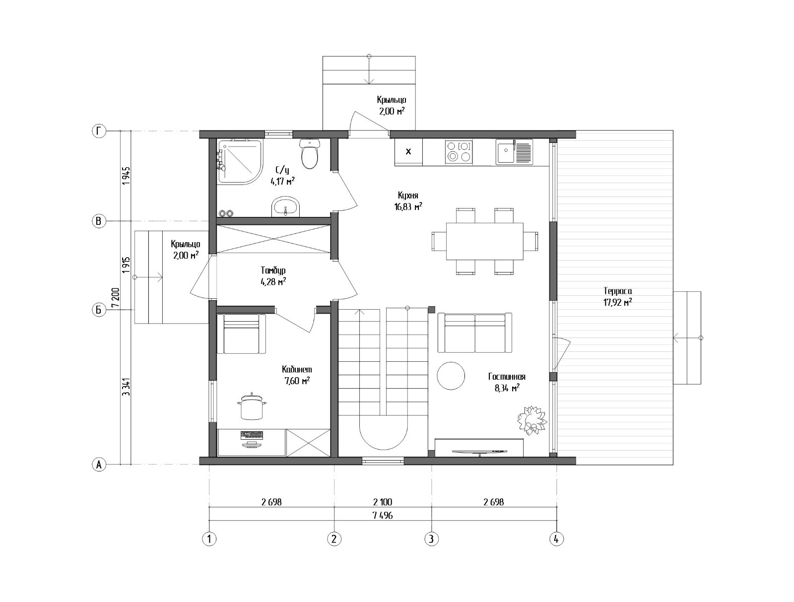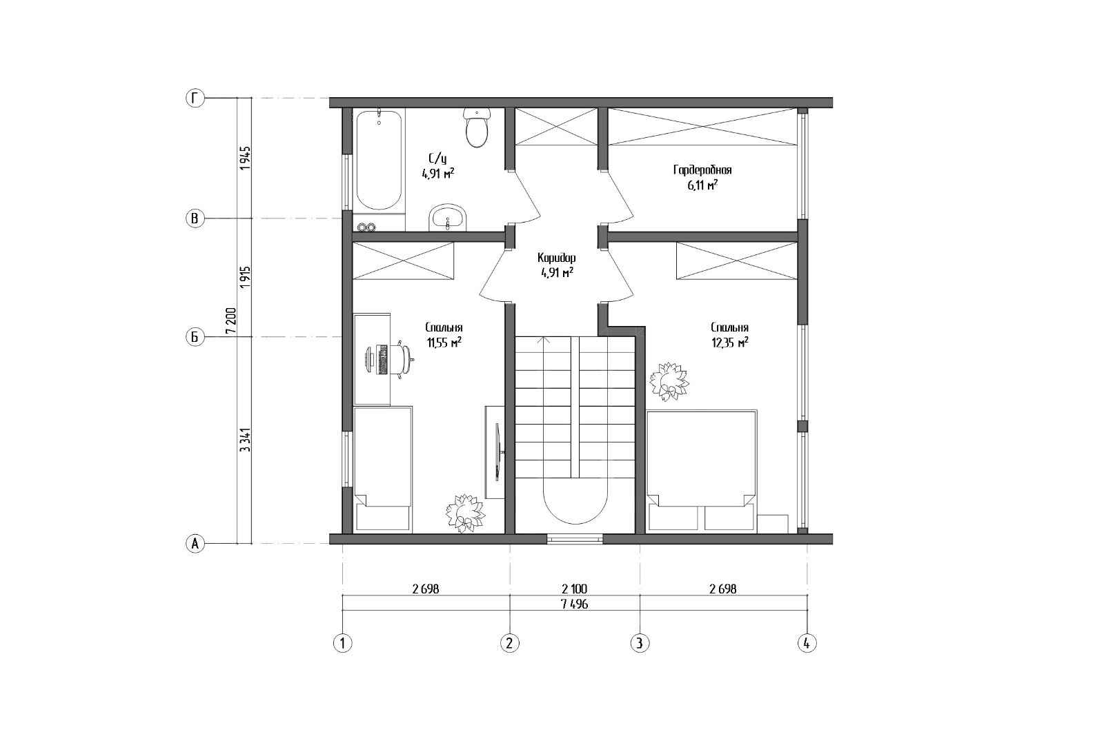 • Внутренние перегородки-каркас из сухой строганной доски: несущие 46х145 мм. Сборка в стоимость не входит